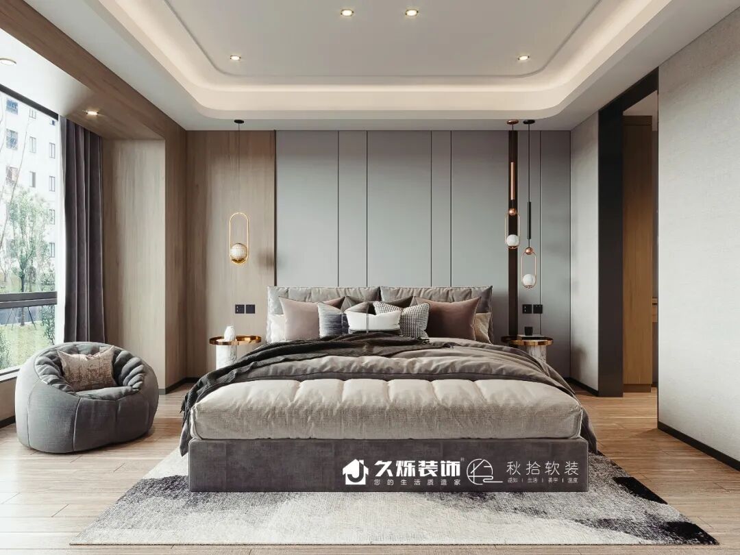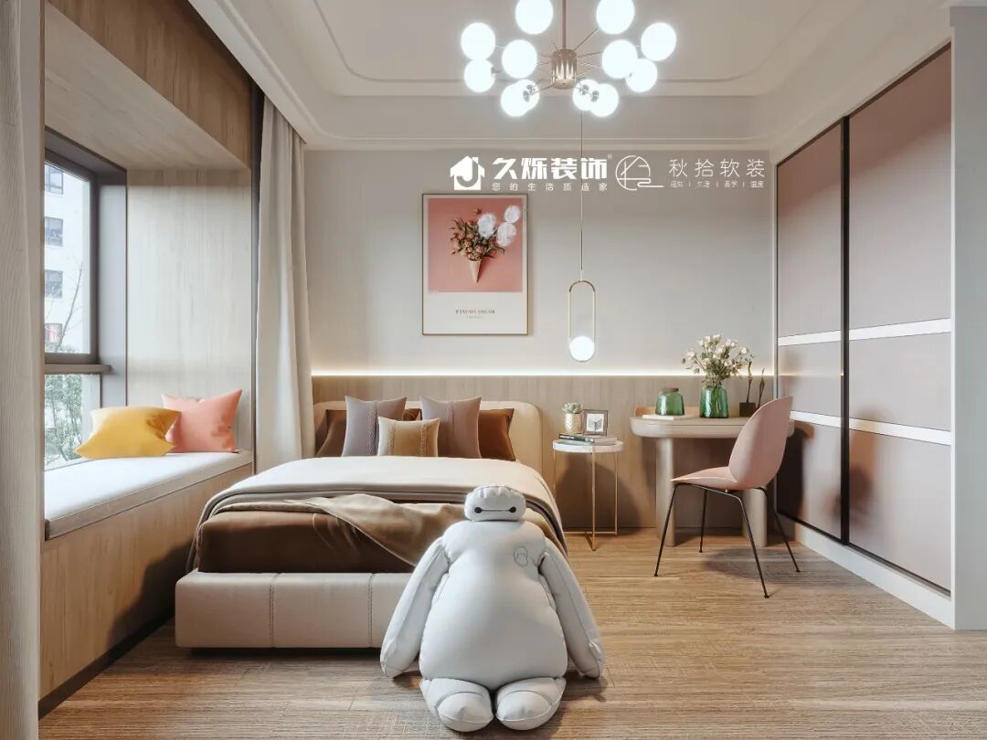 温柔的木元素遇到了粉色,柔软之中揉入了一丝俏皮。床头背景配上灯带,俏皮的同时也不乏一丝稳重。