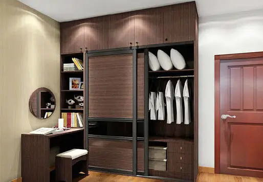 解决方法:布置衣柜区域有柱子,可以在此处做成浅柜的形式,解决掉柱子的问题。浅柜与梳妆台的拼搭,让梳妆台与衣柜整体统一,更具连贯性。