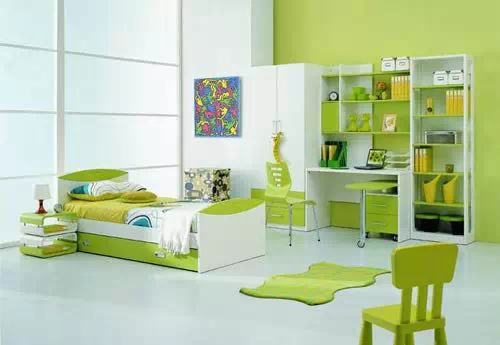 儿童房是个充满童趣的空间,亦需培养孩子对于物体形状及颜色的感知能力。此法在儿童房的墙面制作若干六方形蜂窝状橱格(也可设计其他简便、活泼的几何造型),具体做法是用普通大芯板做基材,外表抹灰,最后涂刷彩色乳胶漆。这一设计可引起孩子的想象力发挥,并且与儿童房的整体主题相呼应。