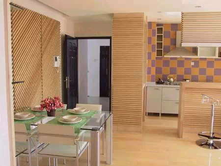 独立的小餐厅一般难以形成良好的围合式就餐环境。此法针对这一问题,在小餐厅的上方天花上做小型的方型吊顶以压低就餐空间,营造餐厅的围合式就餐气氛;同时将吊顶和吊灯合二为一,由于吊顶的作用,此处可以选择价格便宜的吊灯,但借助吊顶的“气势”,完全可以烘托就餐的主题,并且满足了空间、照明等诸多功能需求。