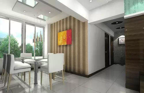 在室内餐厅的局部墙面,使用与小区室外用的瓷砖同类的墙砖,形成与室外社区公共空间浑然一体的效果,令人在潜意识里有置身室外空阔空间的错觉,以此扩大室内空间。此法事实上是采用了借用空间的手法,还能由此体现出室内外相互融合的作用。