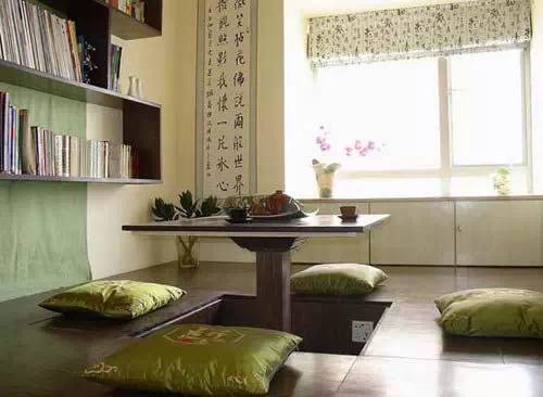 在中小户型里,将某间房间设计成榻榻米形式,可以说是最能节省空间、扩大房间功能的方法。制作榻榻米房间时,可将房间地面抬高,并在地台内设计若干个上拉门式或侧拉门式储物柜,可存放大量的被褥及其他杂物,节省出许多储物空间;同时,榻榻米可以承担品茶、聊天、休闲、阅读、睡眠等多种功能,特别是对于中小户型业主来说,具有极为强大的“夜间亲朋留宿”的功用。