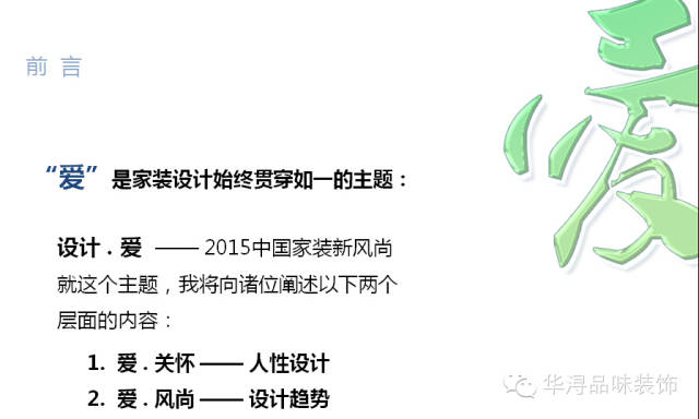 由华浔品味装饰集团主办的“设计·爱”2015中国家装新风尚高峰论坛于9月15日成功举办,引起了业界的极大关注和热烈反响。论坛围绕“设计·爱”这个主题,从“爱·责任”、“爱·健康”、“爱·关怀”、“爱·风尚”等方面全方位解读室内设计与爱的关系。