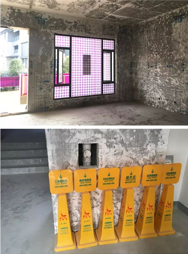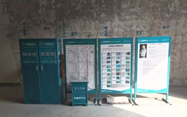 ▲刚进入施工现场,小编便看见储物柜、衣帽柜、灭火箱,以及三块展示牌依然按照标准摆放在一楼,井然有序。