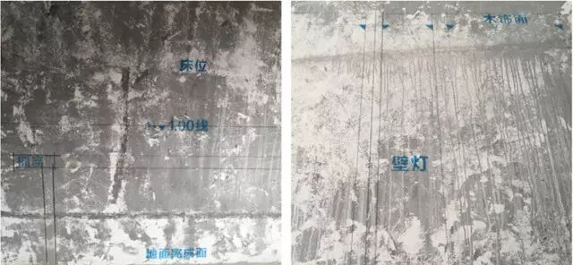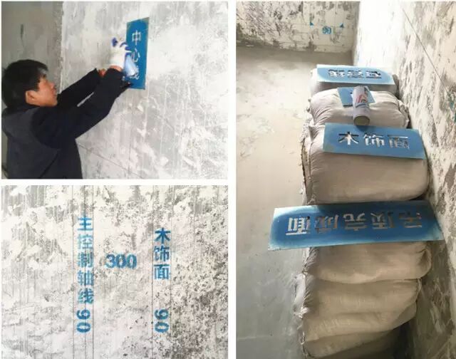 ▲项目经理正在二楼亲自示范现场放线,工人师傅们将严格按照设计师的图纸放出各种饰面、造型等的位置。