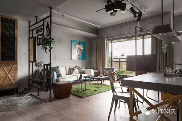 ▲ 这个案例是用水管制作的隔断,特别的造型,同时还融入了换鞋凳、镜子、置物等功能,粗犷的造型中内涵细腻