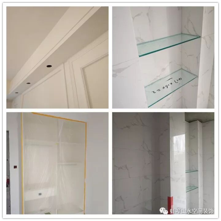 施工现场局部细节,吊顶与柜体制作完成,柜体在油漆之前做好保护,防止油漆弄在柜面上不易打理;卫生间壁龛位置细节处理到位,玻璃与瓷砖衔接自然,实用且易打理;