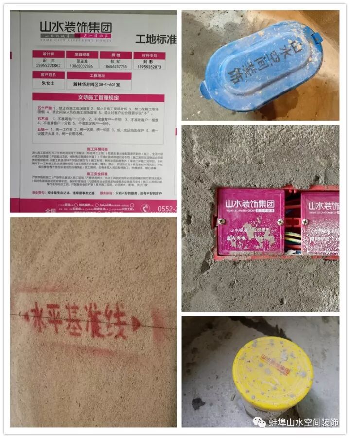 工地现场内的细节,对于施工的现场管理,山水有着一套规范完善的流程与标准,下水管道的保护盖防护(防止后期施工异物落如管中,照成堵塞)、水电完成后的面板保护盖(在安装面板前防止小孩与后期施工对线盒造成破坏)等细节;