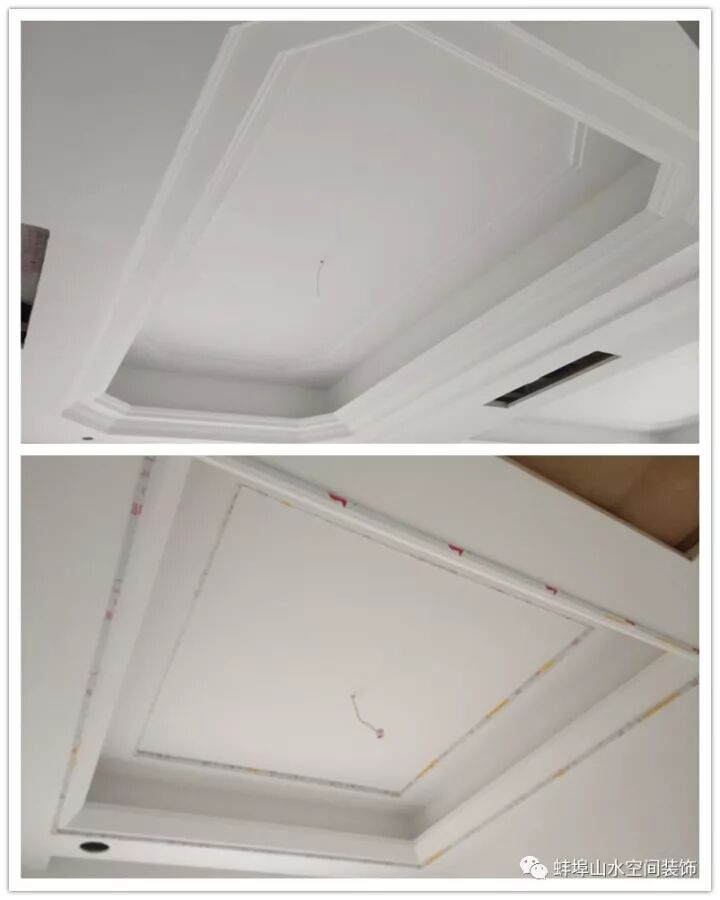 吊顶与电视背景墙区域展示,平直度与打磨的都比较好;瓷砖铺贴细节,从倒角和平整度来区分贴砖的好坏优劣;