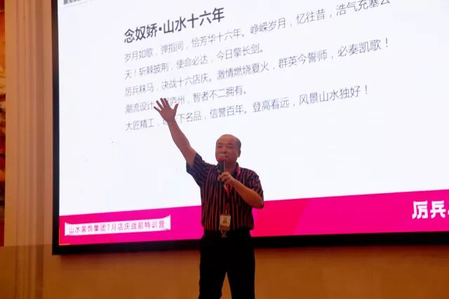山水装饰集团董事长宋春红先生在本次特训营做总结发言,宋总鼓舞大家用更加饱满的工作热情迎接即将来临的业绩挑战,并积极总结过往,集聚上进力量,才是成功的保证。