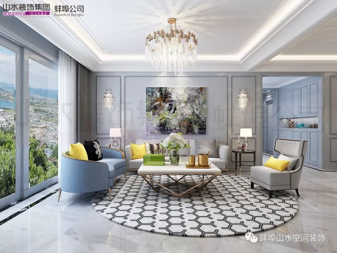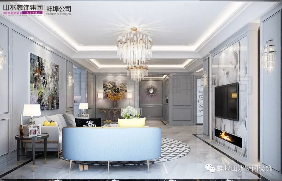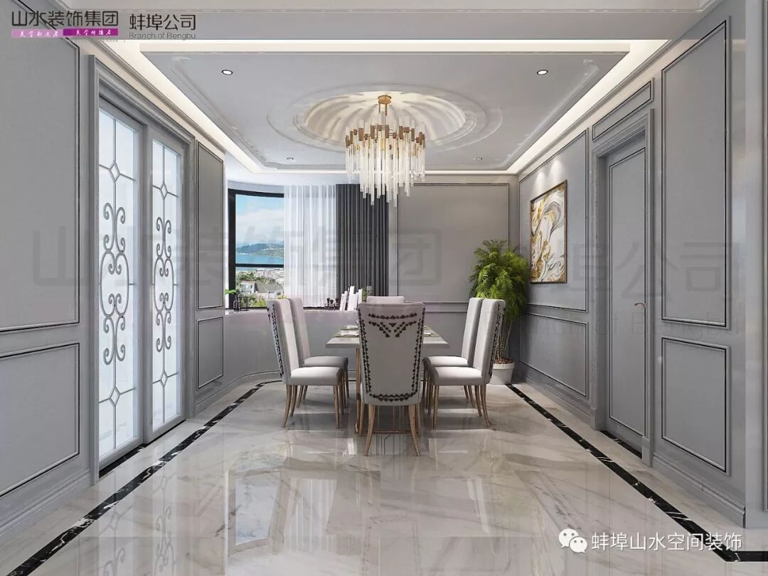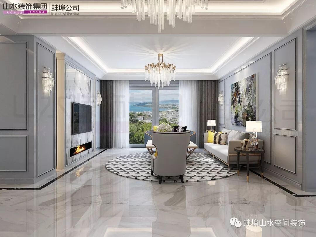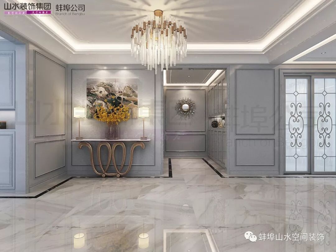 主要材料:云多拉灰大理石、爵士白大理石、黑白根大理石、浅灰色护墙板、实木地板、墙纸、仿石材地砖、黑色拉丝不锈钢、玫瑰金色不锈钢
