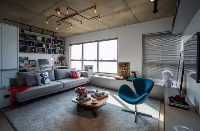 又或者像这个客厅,除了有客厅的功能以外,还兼具了书房的功能,想要做到这样,只需要在客厅旁边的墙面打一排书柜就可以了。这样这一个厅就有客厅和书房两种功能,棒棒哒!一举两得!