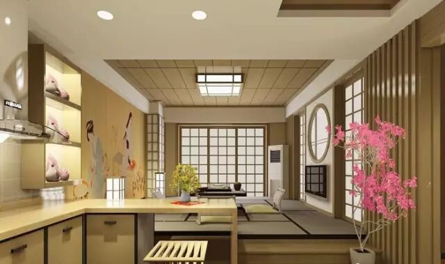 日式风格空间造型极为简洁、家具陈设以茶几为中心,墙面上使用木质构件作方格几何形状与细方格木推拉门、窗相呼应,空间气氛朴素、文雅柔和。 一般不多加繁琐的装饰,更重视实际的功能。
