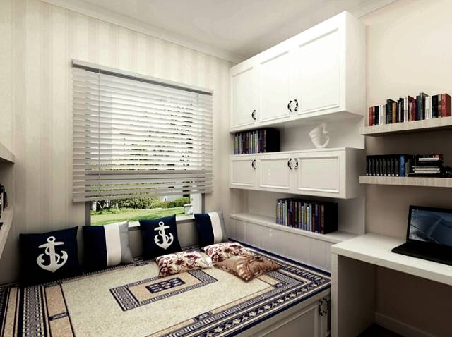 设计小贴士:设计之初,业主重点强调的就是要实用与装饰完美结合。我们针对小卧室,设计成集休息、娱乐、学习、储物于一体的多功能房,而定制的榻榻米与书柜的设计正符合这不到9㎡的小卧设计,充分利用每一寸空间。