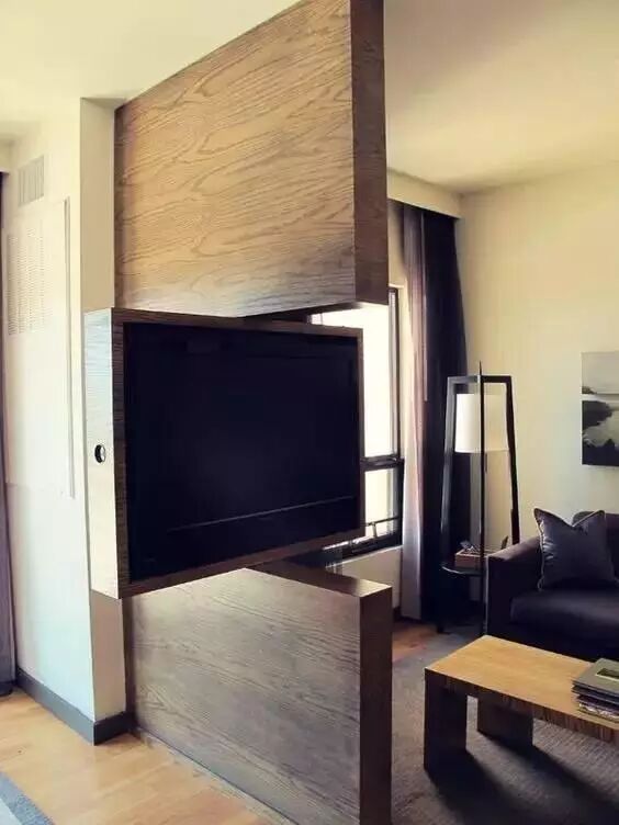 旋转型的电视墙是比较有创意的,适合在一些大空间使用,比如下面这款,电视360度旋转无压力,想怎么转就怎么转!如果在餐厅吃饭,只要把电视转到餐厅,就可以边吃饭边看电视,非常人性化!