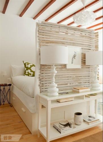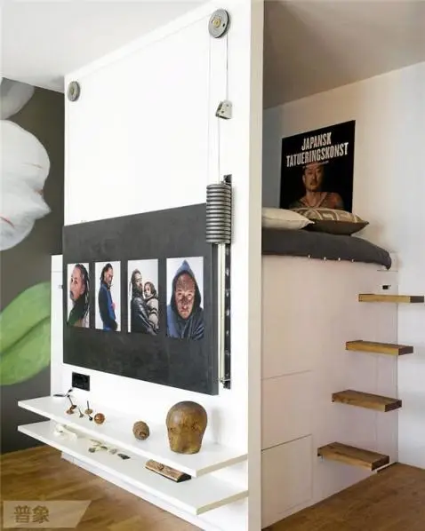 上面已经介绍了床隐藏在高架地板下或悬吊在空中,那还剩下什么没介绍的呢?呵呵,是墙壁,节省空间的多功能家具如雨后春笋般出现在狭小空间。