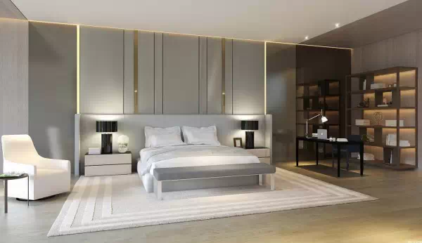 在床背景上设计一个壁龛是很多常见的设计手法,很实用,还有美化装饰的作用。当然,你可以选择其他装饰。