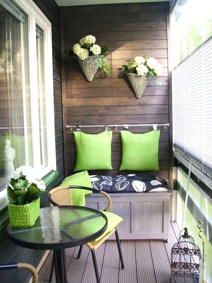 除了植物,阳台的其余部分就是“舒适的座位”这样你休息才能真正的高枕无忧。不要认为好座位的选择必须是昂贵的,下面的长椅是利用塑料存储箱、胶合板和芦苇栅栏制作的。